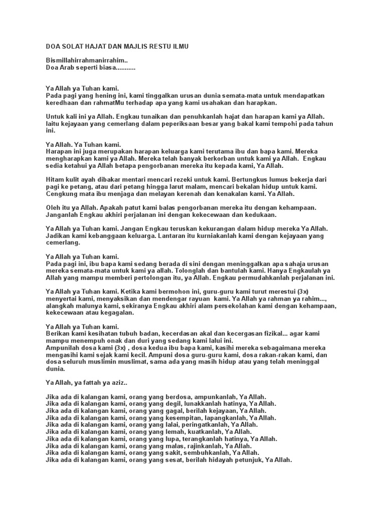 Doa Hajat Brunei Religious Officers Student Association from www.brurosa.com Sebuah amalan doa atau wirid yang mustajab untuk memohon suatu hajat yang besar. Bacalah yasin selepas solat subuh dan ulanglah ayat2 seperti yg tertera. Perlu diingat bahwa yang dimaksud dengan. Doa nabi yunus ini memiliki nama lain yaitu doa dzun nuun yang memiliki keutamaan melepaskan kesusahan bagi orang yang mau mengamalkan.hal ini bukan tanpa alasan, karena nabi yunus adalah salah satu nabi yang mendapat ujian dari allah swt dengan ditelan oleh ikan besar. Amalan ini berasal dari gurunya yang memang diijazahkan untuk memohon suatu hajat yang besar. Oleh karenanya kita bisa lihat banyak orang yang lebih sering sambat di dunia nyata maupun dunia maya. Suatu hajat yang rasanya berat dan nampak sebagai sesuatu yang mustahil baginya. Khasiat atau manfaat dari membaca doa dzikir asma (ya mujib) supaya hajat cepat terkabul paling mustajab atas kehendak allah swt.